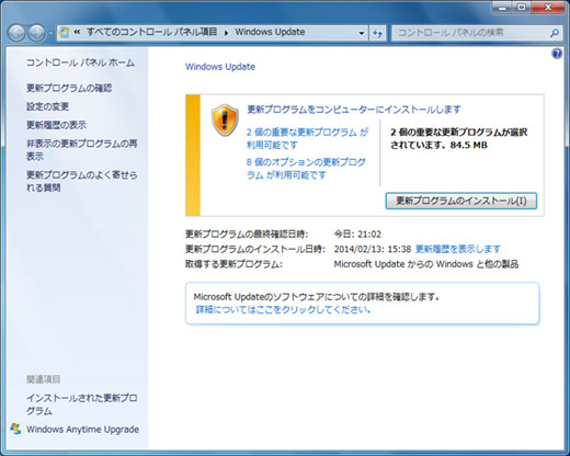 Windows Updateの状態確認画面。ここでは、マイクロソフトが配布している最新の更新プログラムの有無やインストール状況を確認します。自動更新の設定は画面左側の「設定の変更」をクリックします。