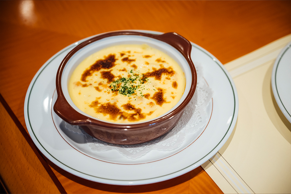 初代総料理長サリー・ワイルが、滞在していた外国の銀行家から「体調が良くないので、何かのど越しの良いものを作って欲しい」という要望を受け、即興で創作した一皿が「ドリア」です。バターライスに海老のクリーム煮を乗せ、グラタンソースをかけてオーブンで焼いたもの。好評だったこの料理は、レギュラーメニューとしてホテルニューグランドの名物料理の一つになりました。その後、弟子達により、他のホテルや街場のレストランでも提供されるようになり、今や全国の洋食の定番料理として大人気となりました。