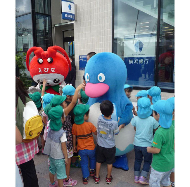 海老名駅前支店のオープンにて、地元のえび~にゃとともにこども達に揉みくちゃのはまペン