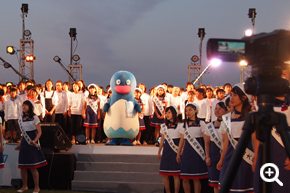 横須賀市津久井浜海岸で開催されたウィンドサーフィン「PWAワールドカップ」にスカリンたちと一緒に会場を和ませるはまペン