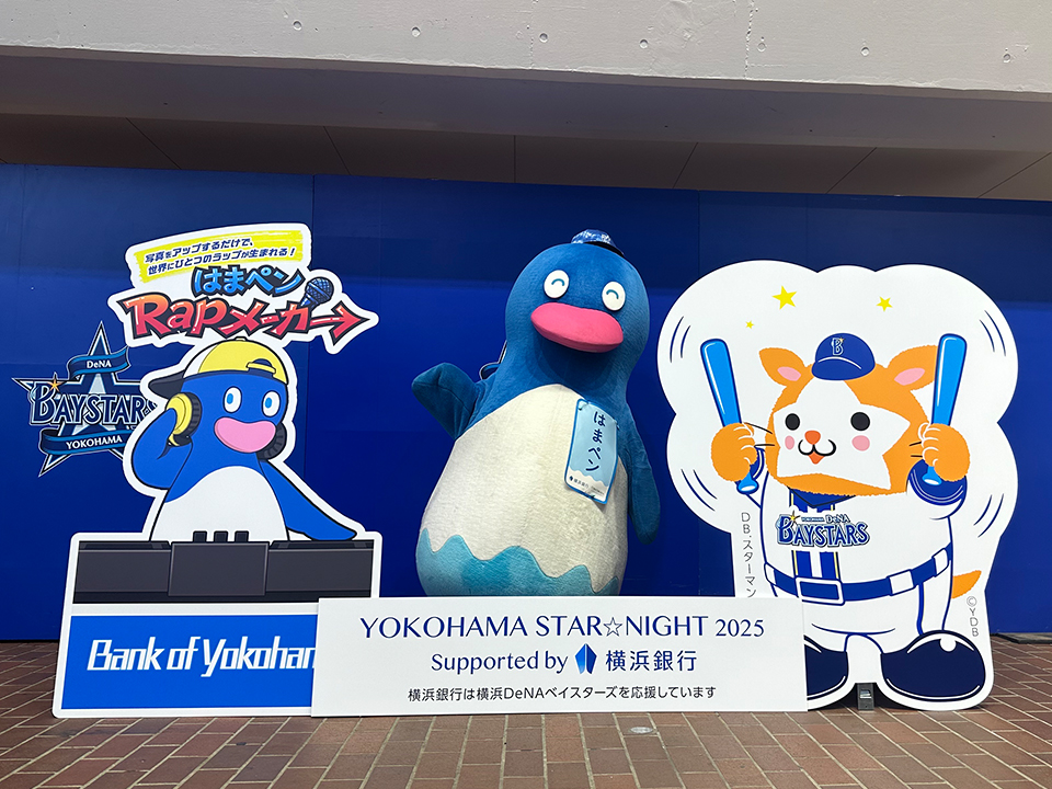 横浜DeNAベイスターズ誕生10周年にスターマンが横浜銀行に遊びに!2019年11月の「ファンフェスティバル」以来の再会に、喜びもひとしおなはまペン。