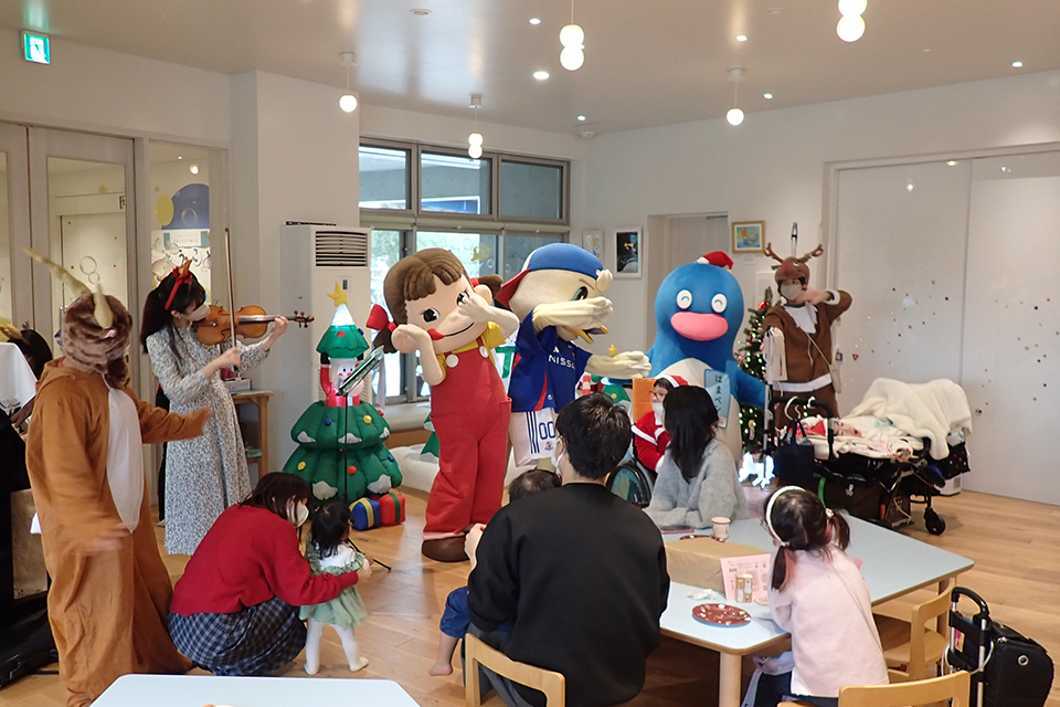 「横浜こどもホスピス~うみとそらのおうち」のクリスマス会に今年も参加。ペコちゃんやマリノスケと一緒にミニコンサートでおどるはまペン