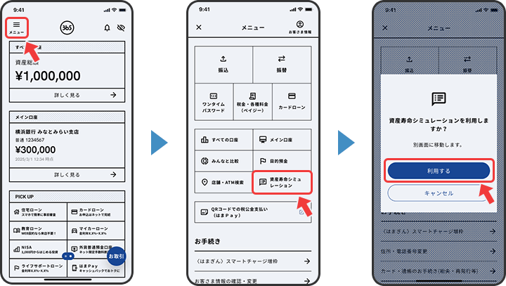 【はまぎん365】の「資産寿命シミュレーション」へはかんたん3タップ!