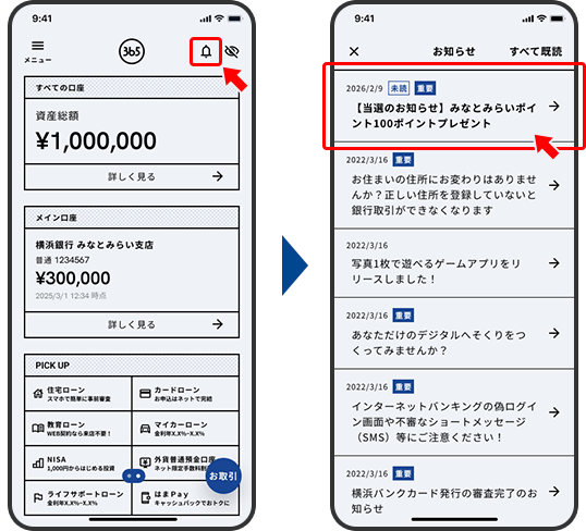 「はまぎん365」マイページ(TOPページ)の右上の「ベルマーク」をタップすると、お知らせ一覧が表示されます。