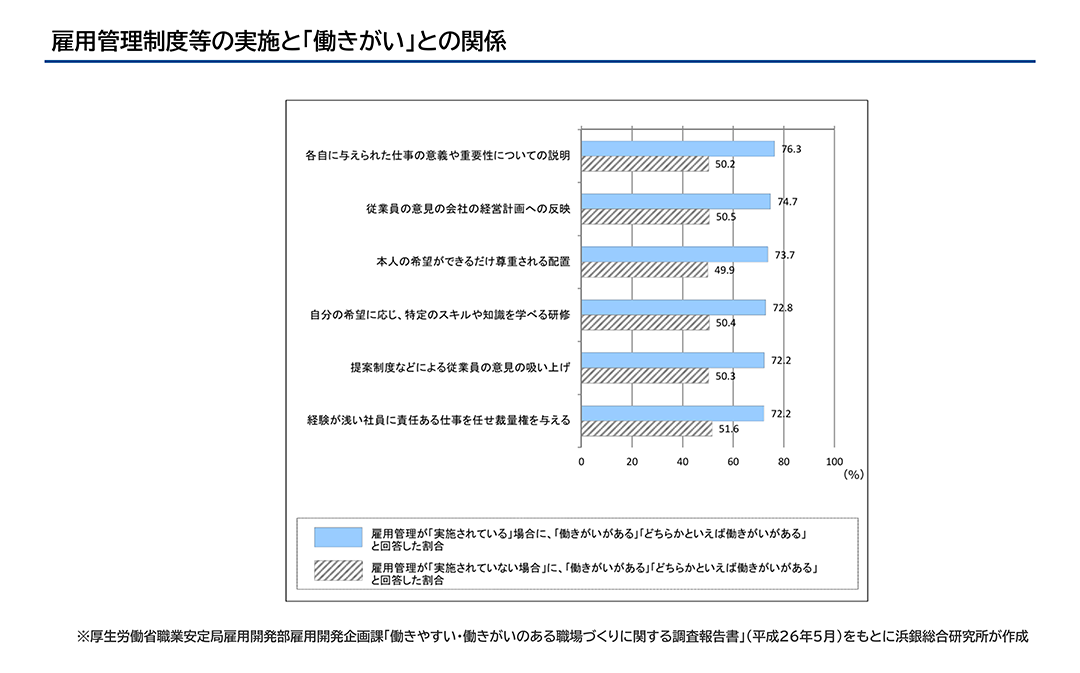 グラフ「雇用管理制度等の実施と「働きがい」との関係」に示すとおり、厚生労働省の調査では、「各自に与えられた仕事の意義や重要性についての説明」「従業員の意見の会社の経営計画への反映」「本人の希望ができるだけ尊重される配置」等の雇用管理をおこなっている企業ほど従業員の働きがいが高い傾向が示されています。