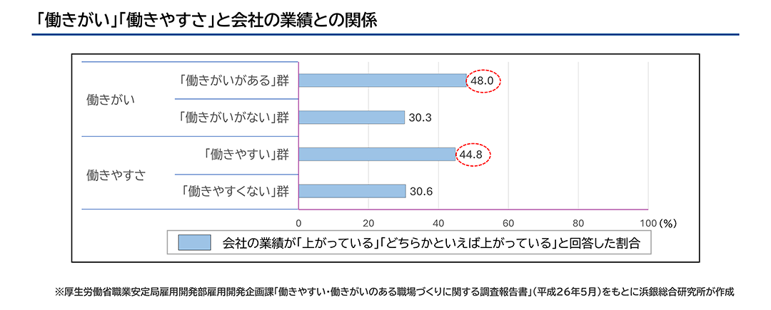 働きがいのある企業は、そうでない企業に比べ、会社の業績が「上がっている」「どちらかといえば上がっている」と回答した割合が高いことが報告されています。