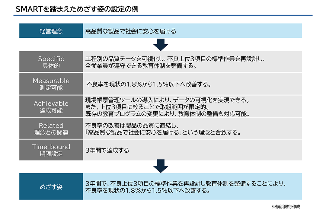 ここでよくある失敗は、「品質を改善する」「生産性を向上させる」といった抽象的な表現にとどめることです。こうした目標では現場が何をすべきか判断できません。