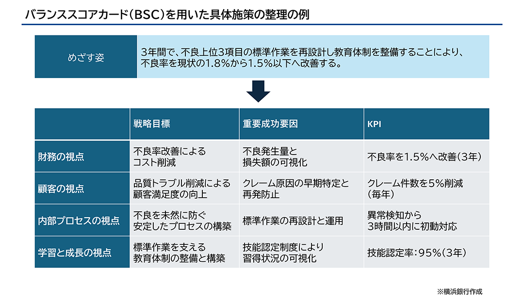戦略目標(KGI)、重要成功要因(CSF)、KPIもあわせて設定し、取るべき方向性をここで定めましょう。ここではめざす姿として定めた「3年間で、不良上位3項目の標準作業を再設計し教育体制を整備することにより、不良率を現状の1.8%から1.5%以下へ改善する」についての作成例を紹介します。