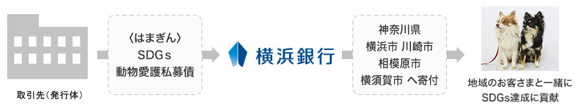 〈はまぎん〉SDGs動物愛護私募債は、お客さまが私募債(※)を発行したことを記念して、横浜銀行が神奈川県内のおもに動物愛護センターを設置する自治体に、発行金額の0.1%相当額を寄付するものです。