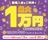 【エントリー要】(Visa限定)新規入会&ご利用で最大1万円キャッシュバック+Vポイントギフトプレゼントキャンペーン(2026年1月5日~2026年6月30日まで)