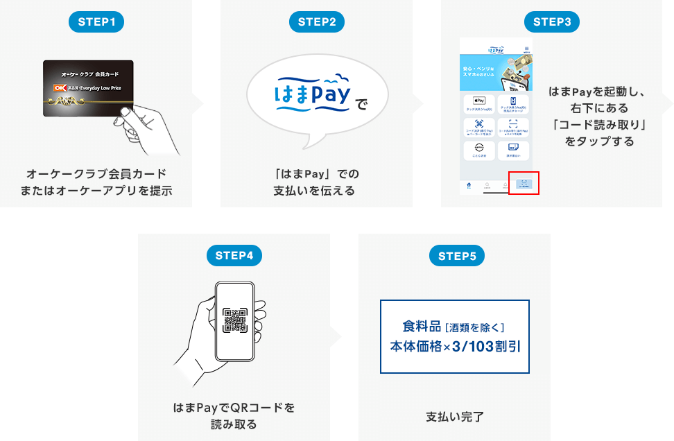 ![はまPayならOKでのお買い物がおトクに! 現金でのお支払いと同様はまPay[コード決済(ユーザー読み取り)]でのお支払いでも食料品[酒類を除く]本体価格×3/103割引※ ※オーケークラブ会員で、現金払いのお客さまに実施している単品ごとの本体価格×3/103の割引が、「はまPay」のコード決済にも適用されます。](/shared/images/kojin/hamapay_ok_mv_01.png)