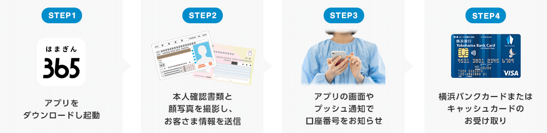 スマホアプリ「はまぎん365」での口座開設手続きは、普通預金口座のお取り扱いとなります。開設された普通預金口座は、Web口座(無通帳口座)かつ印鑑レス口座となります。