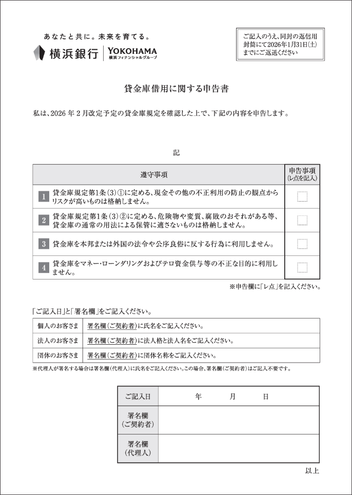 貸金庫をご契約されているお客さまへ、貸金庫規定改定をお知らせするダイレクトメールを順次お送りしております。