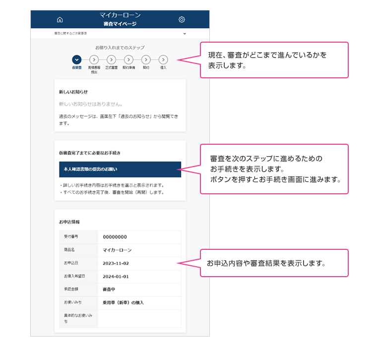 • 審査結果連絡時や新たな依頼事項がある場合は、メールおよびSMS(ショートメッセージサービス)※2で通知します。審査結果や必要なお手続きは、審査マイページ内に表示されます。