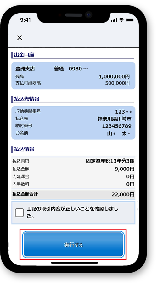 内容確認後、「実行する」をタップし、受付番号が表示されたら払い込み完了!